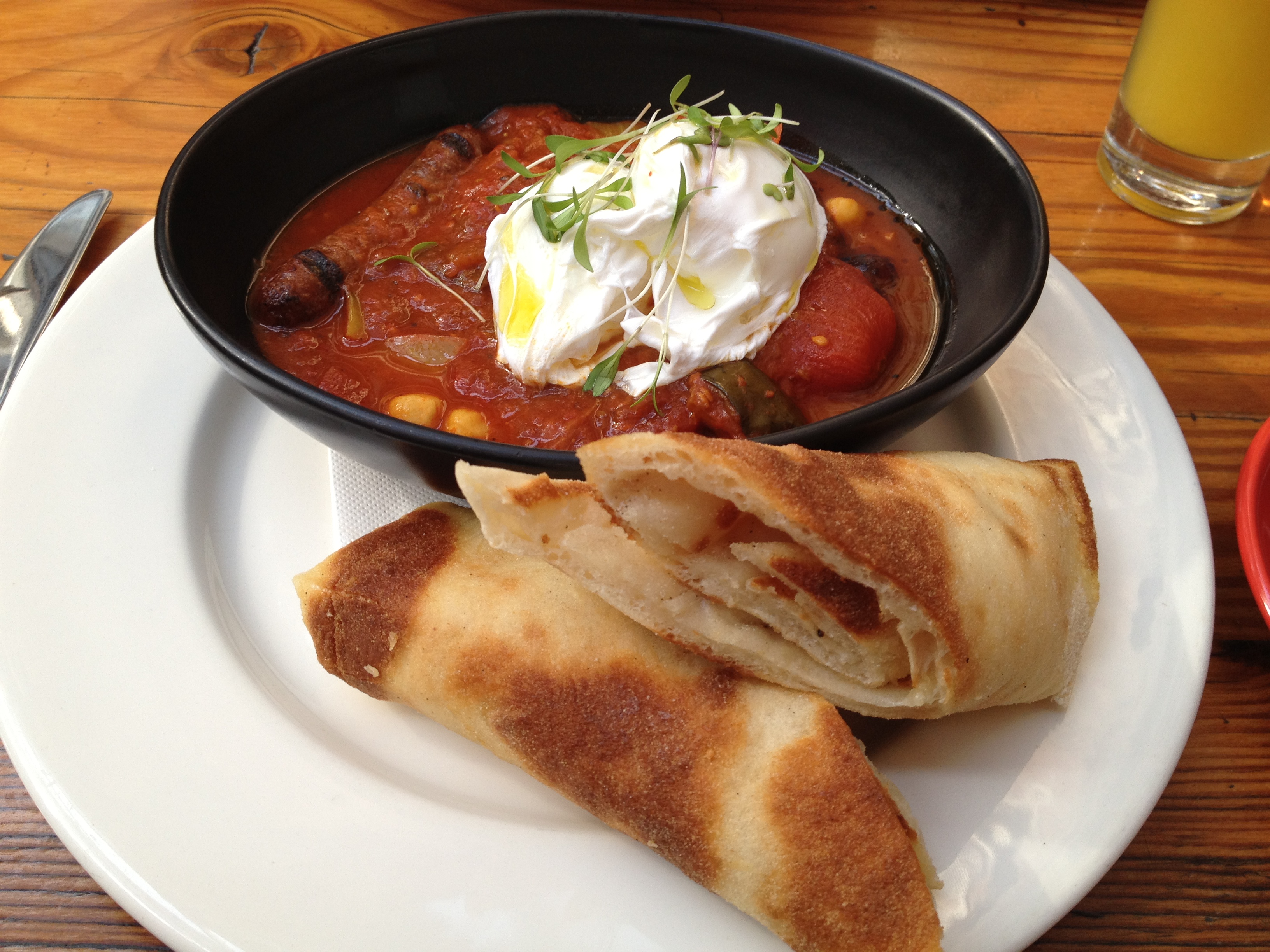 “Shady deal” – shakshuka of stewed spiced tomato, eggplant, peppers, chickpeas, merguez sausage with meredith goats’ feta, dukkah, poached eggs and grilled flatbread
