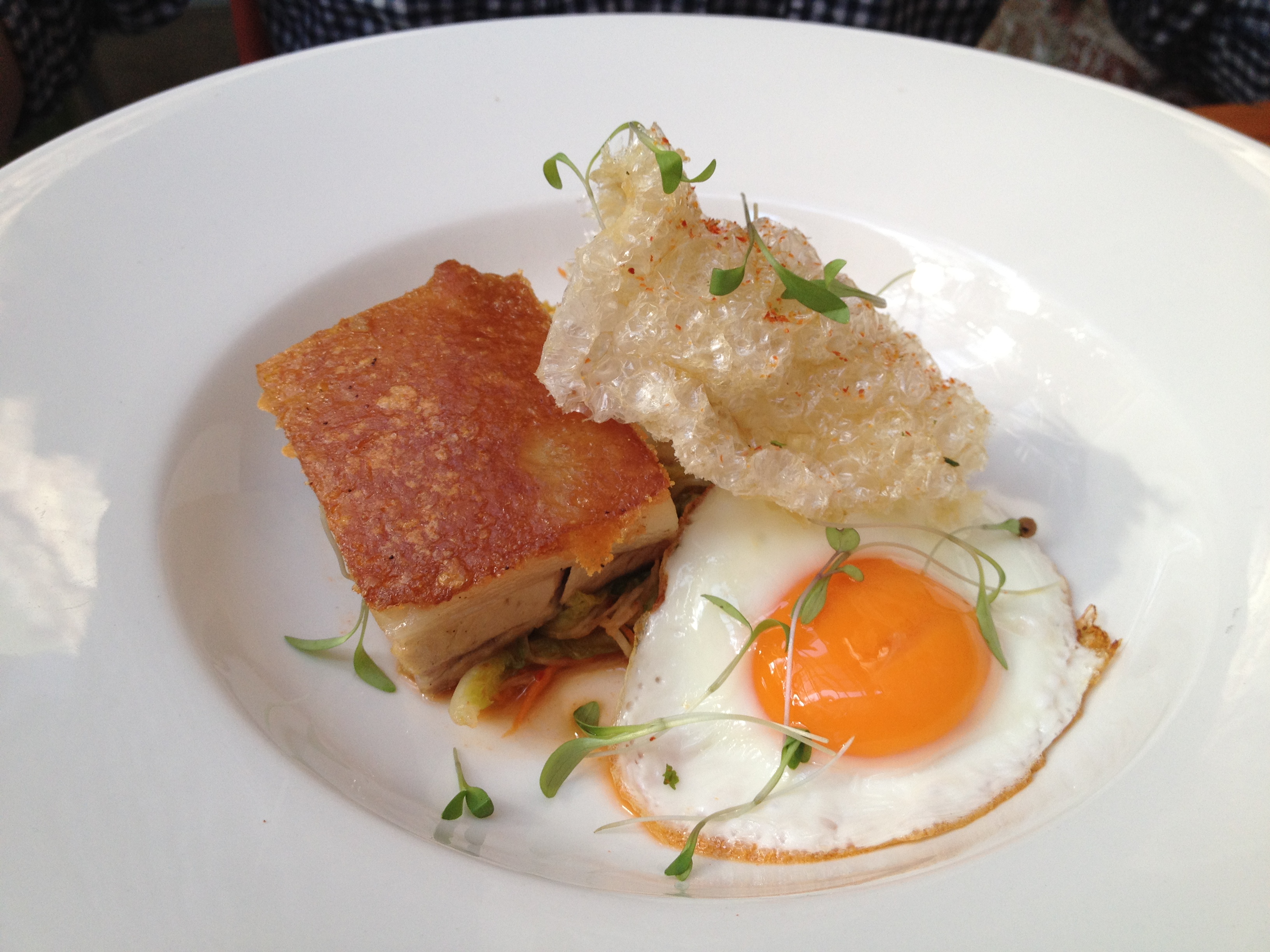 Twice cooked kurobuta pork belly with kohlrabi kimchi, fried egg and chicharron