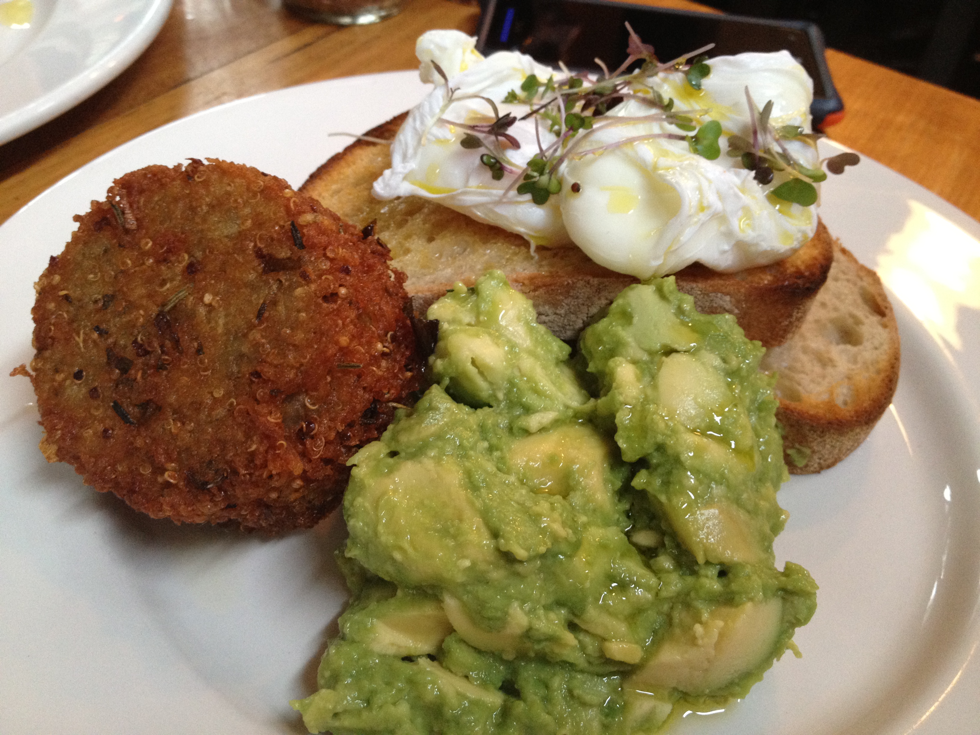 Poached eggs on sourdough – generous serving of sourdough and avocado, delicious quinoa potato hash = Good