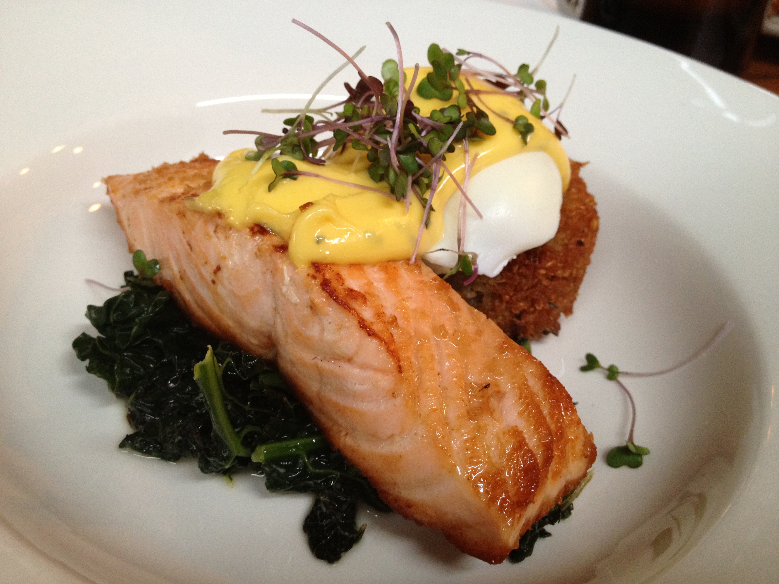 Salmon – enjoyable salmon, eggs, buttered kale, creamy bernaise sauce, delicious quinoa potato hash = Good