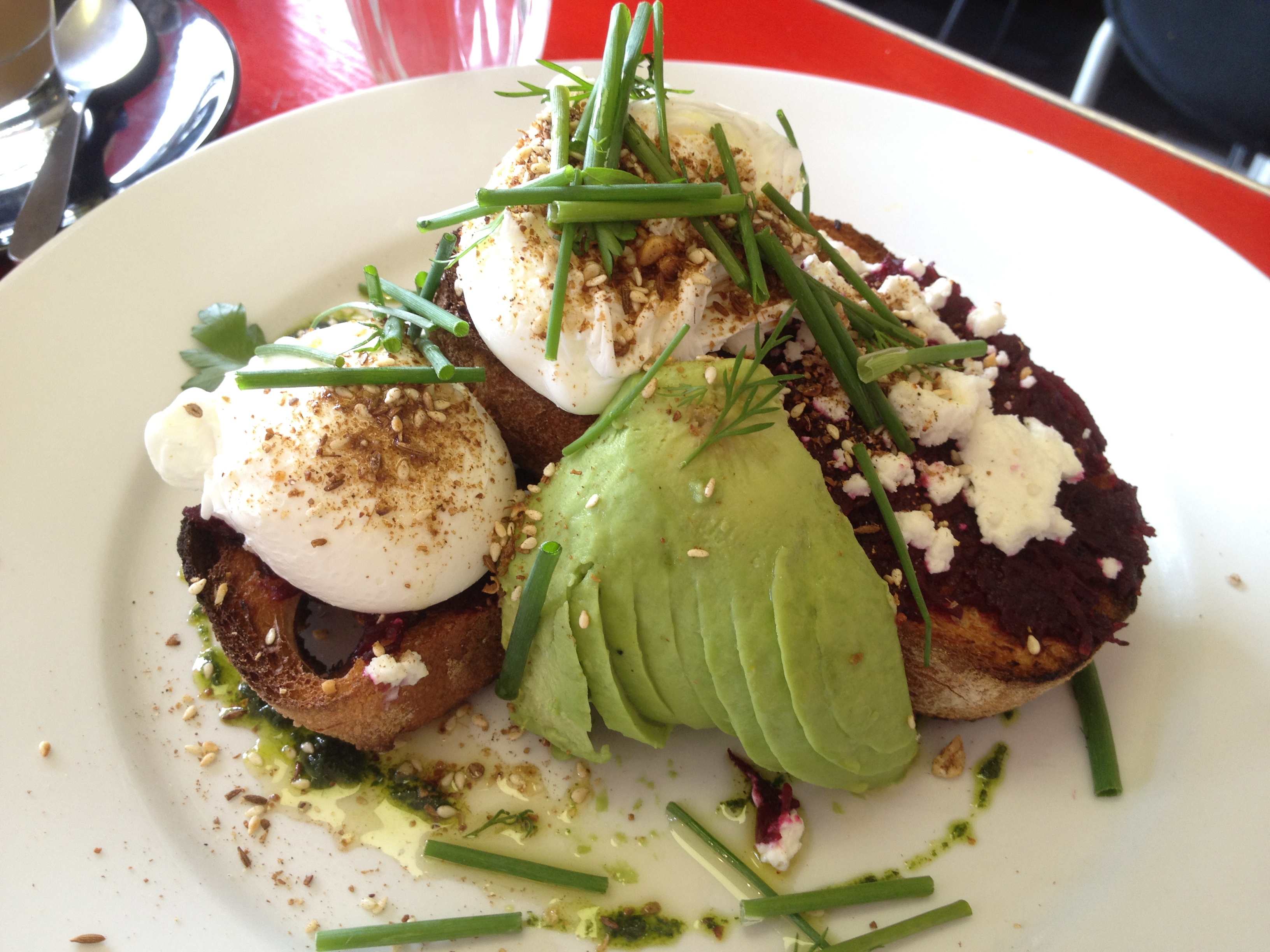 Beetroot relish, avocado and goats cheese on toasted sourdough with poached eggs and dukkah