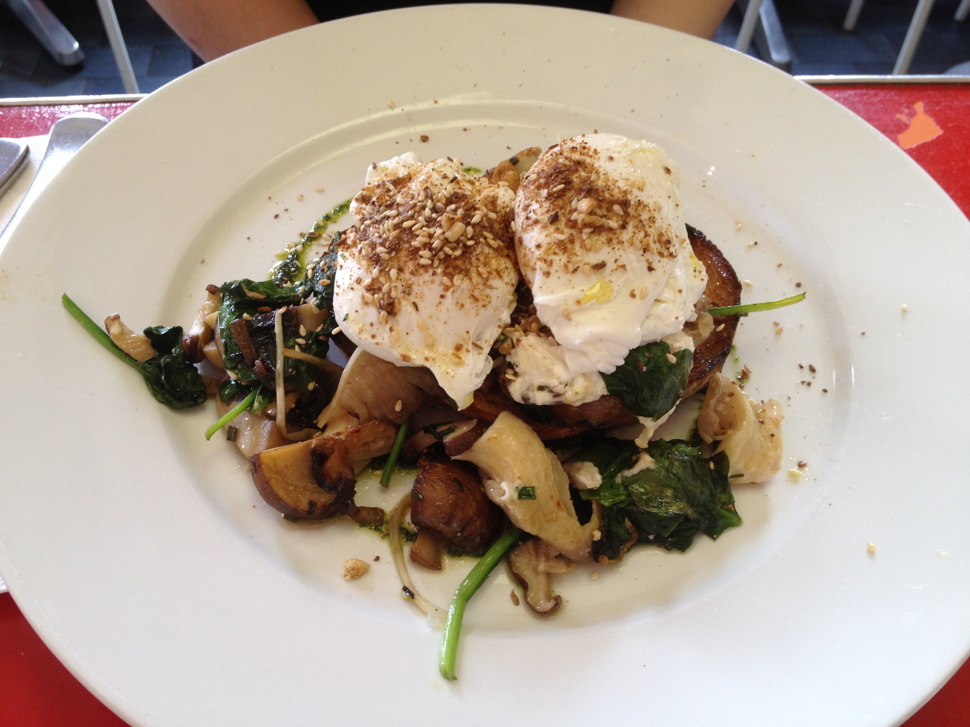 Sautéed garlic mushrooms, spinach and goats cheese on toasted sourdough with poached eggs and dukkah