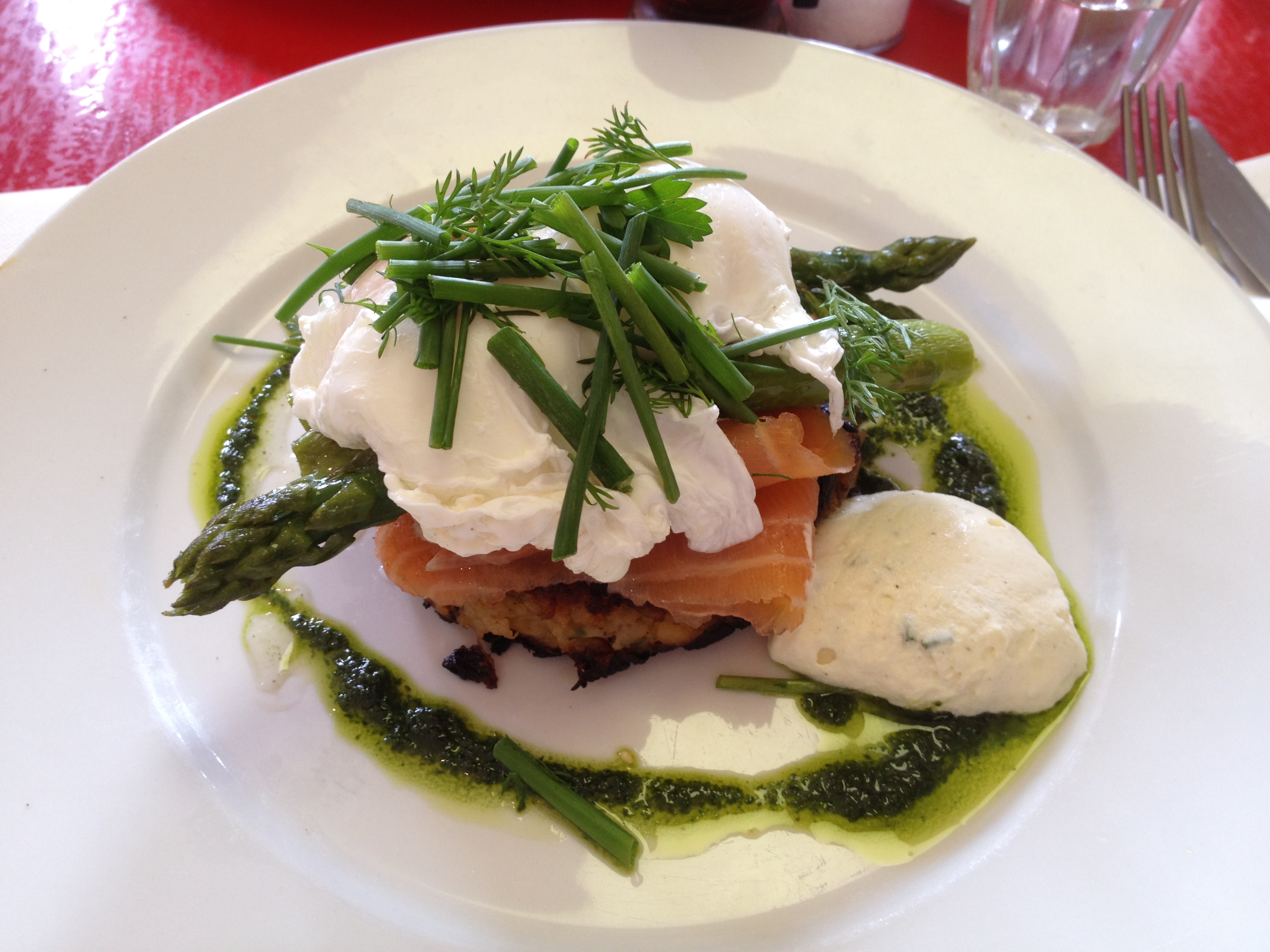 Potato and herb cake topped with smoked salmon, asparagus, poached eggs, soft herbs and horseradish cream