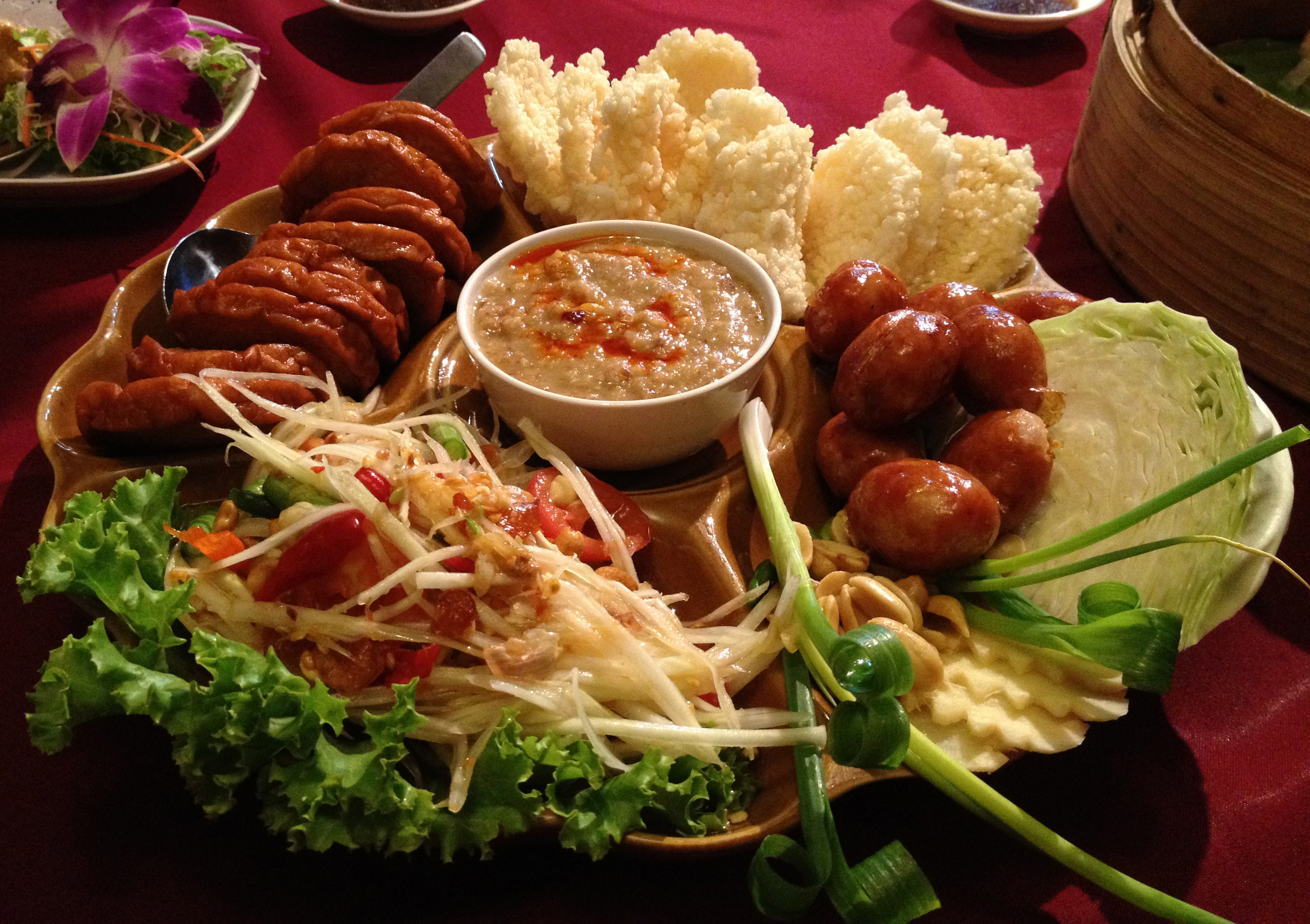 Spicy pork sausage (moo yor), crispy rice cakes (eaten with the peanut/coconut sauce), Thai fermented sausage (sai krok Isan), spicy papaya salad