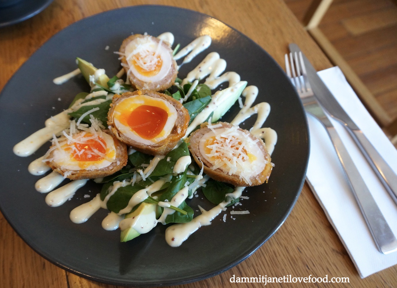 Chorizo scotch eggs with avocado, manchego, spinach and seeded mustard mayo
