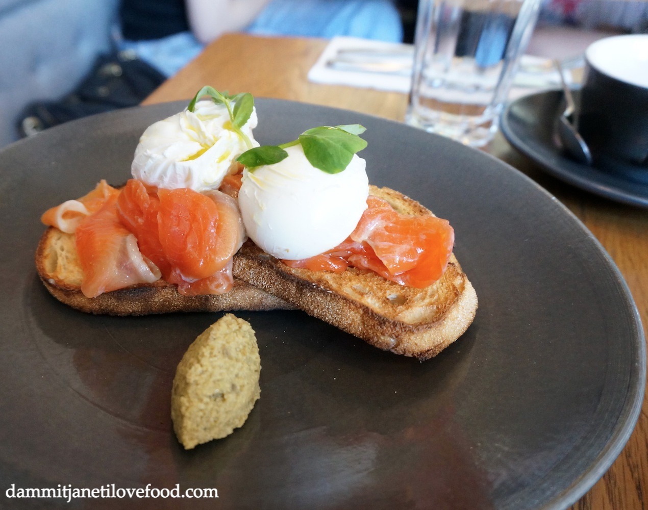Citrus cured NZ King Salmon, green olive tapenade, poached eggs on dark rye