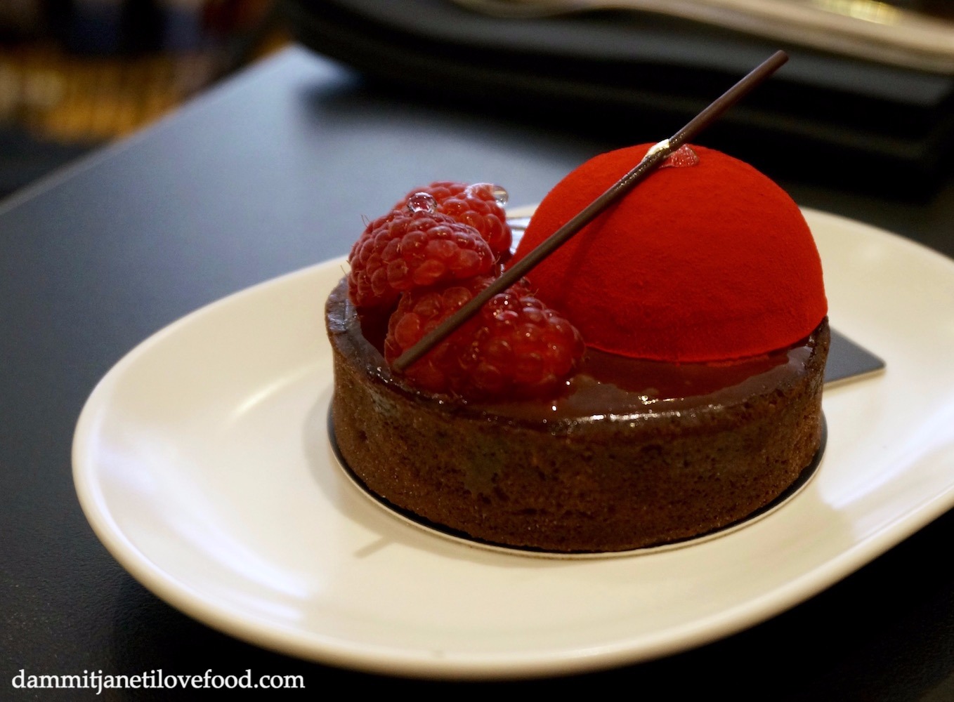 (chocolate sablé, raspberry compote, ‘inaya’ chocolate ganache, raspberry mousse)
