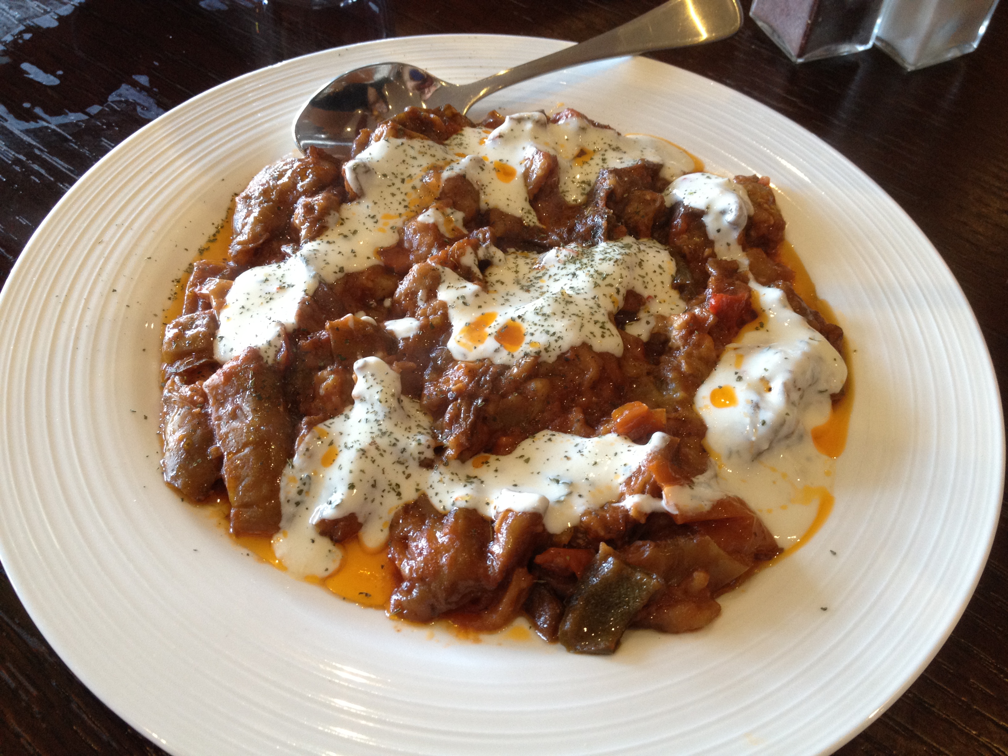 Fried Eggplant covered with a tomato and yoghurt sauce.