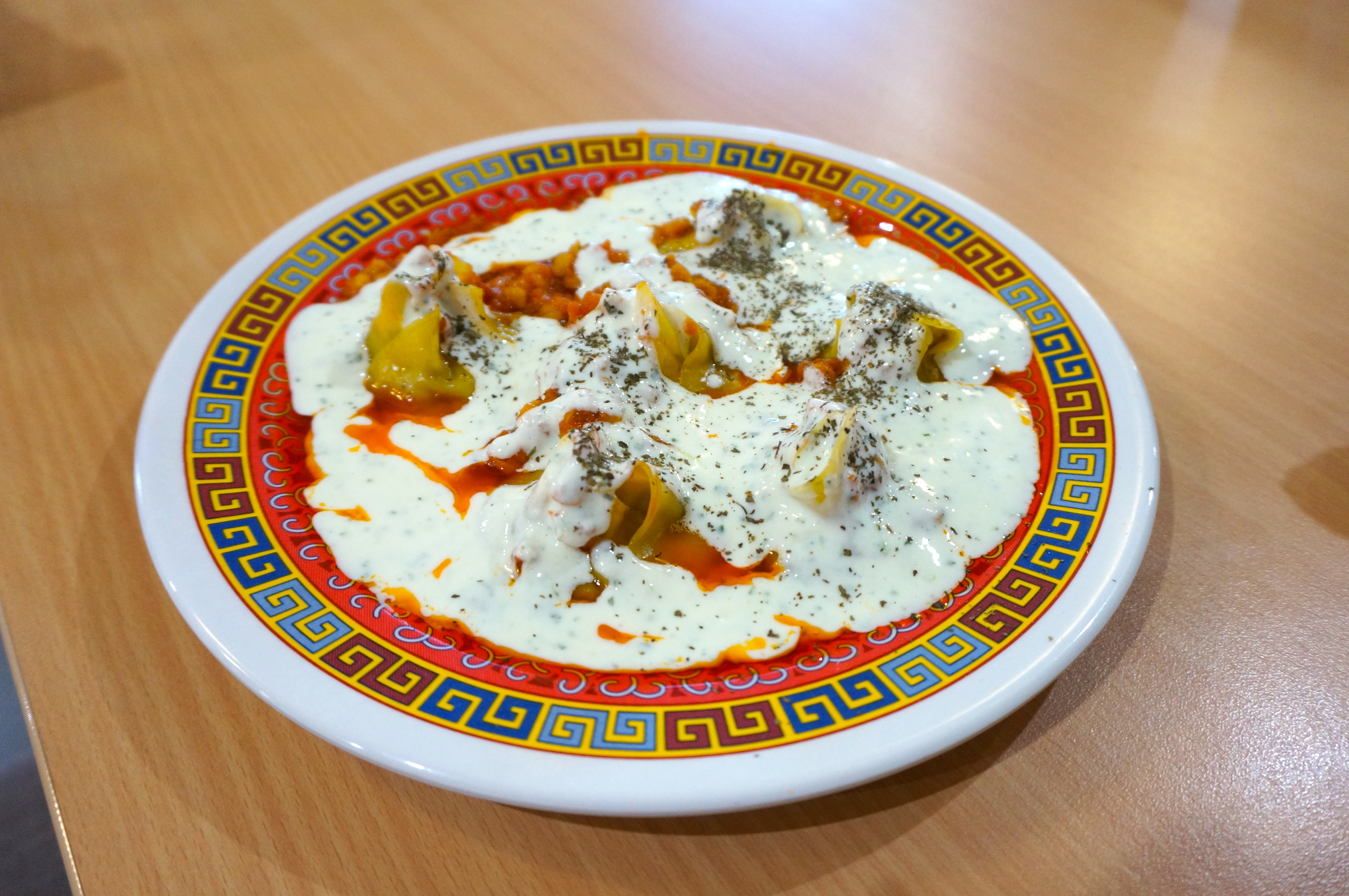 Steam cooked traditional Afghani dumplings made from pastry, lamb mince and onions, served with lentils, topped with yoghurt and tomato gravy.