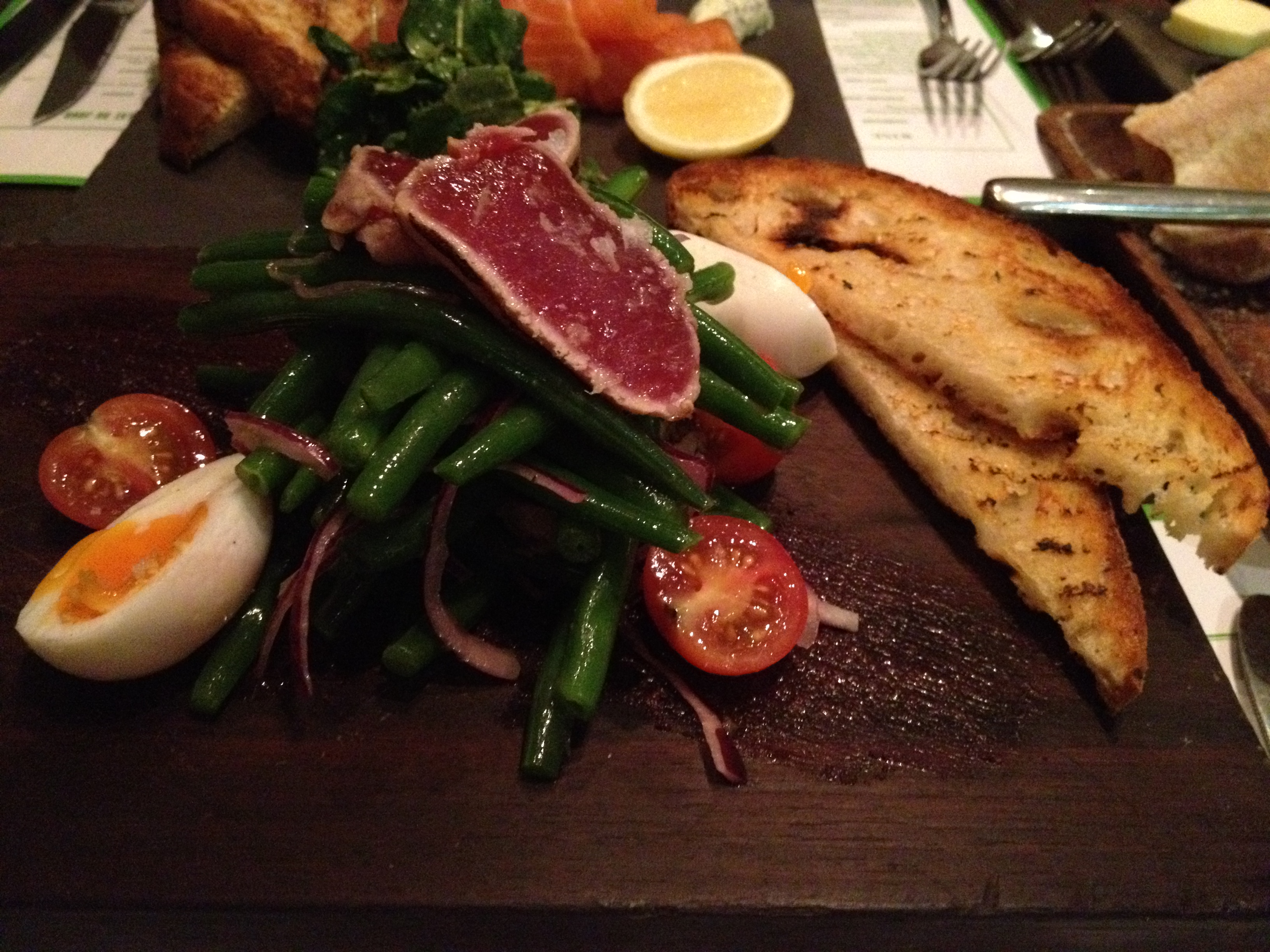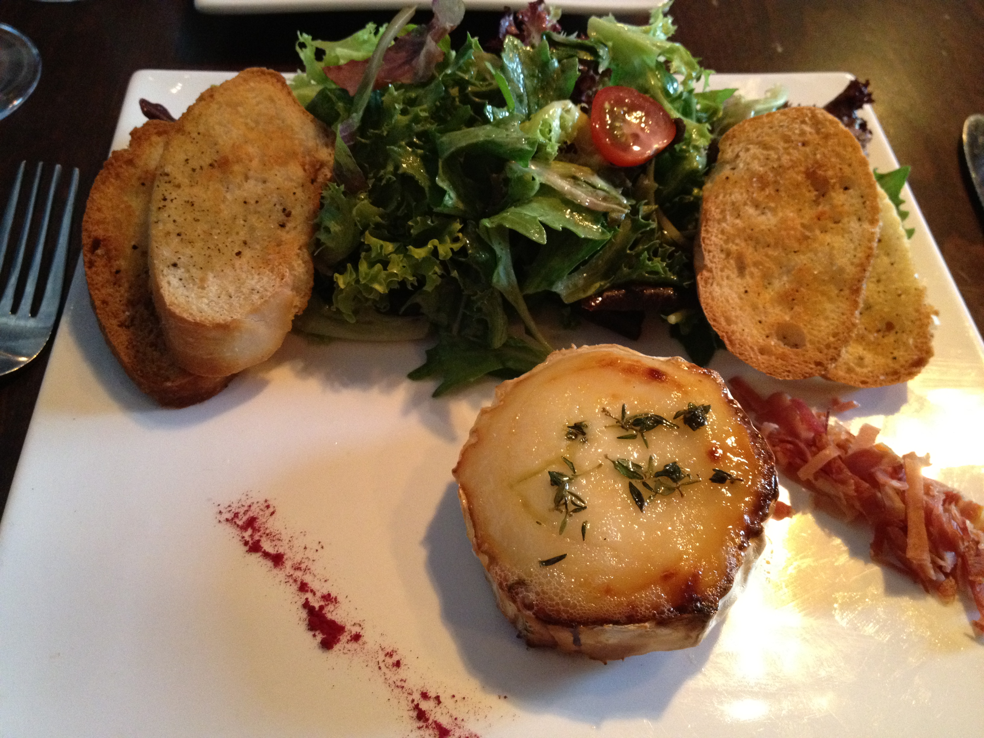 Salade de chèvre chaud – Warm goats cheese salad. The cheese (served gratiné-style) was deliciously creamy = Good