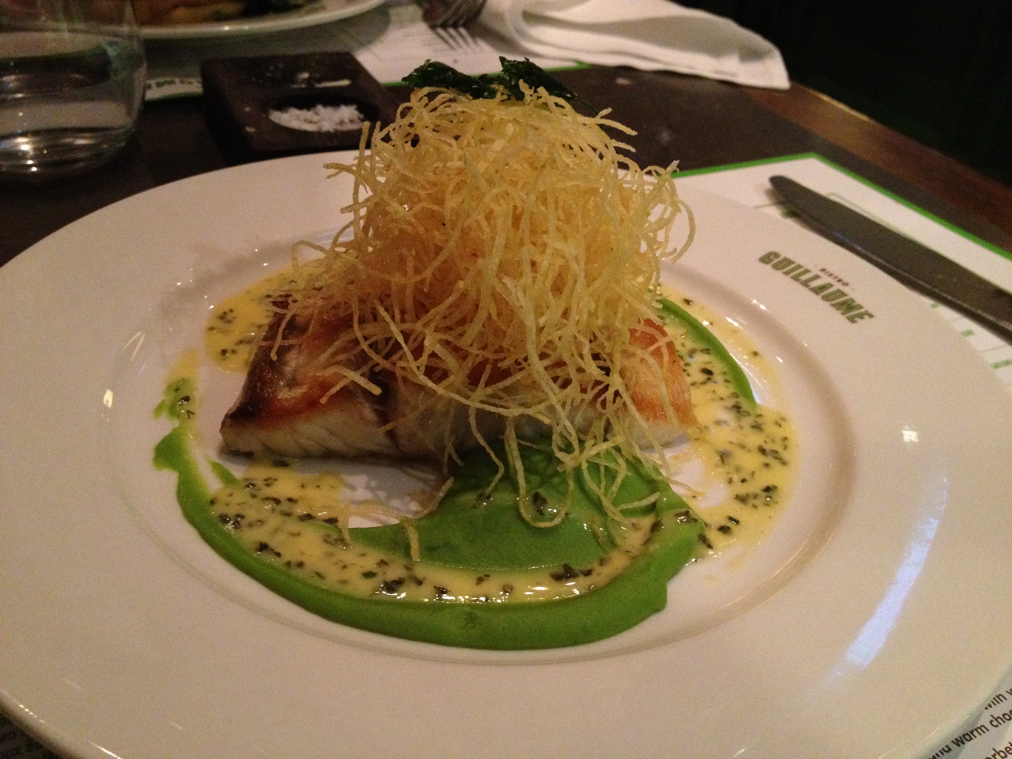 Barramundi with pea purée, tarragon butter and pommes allumettes