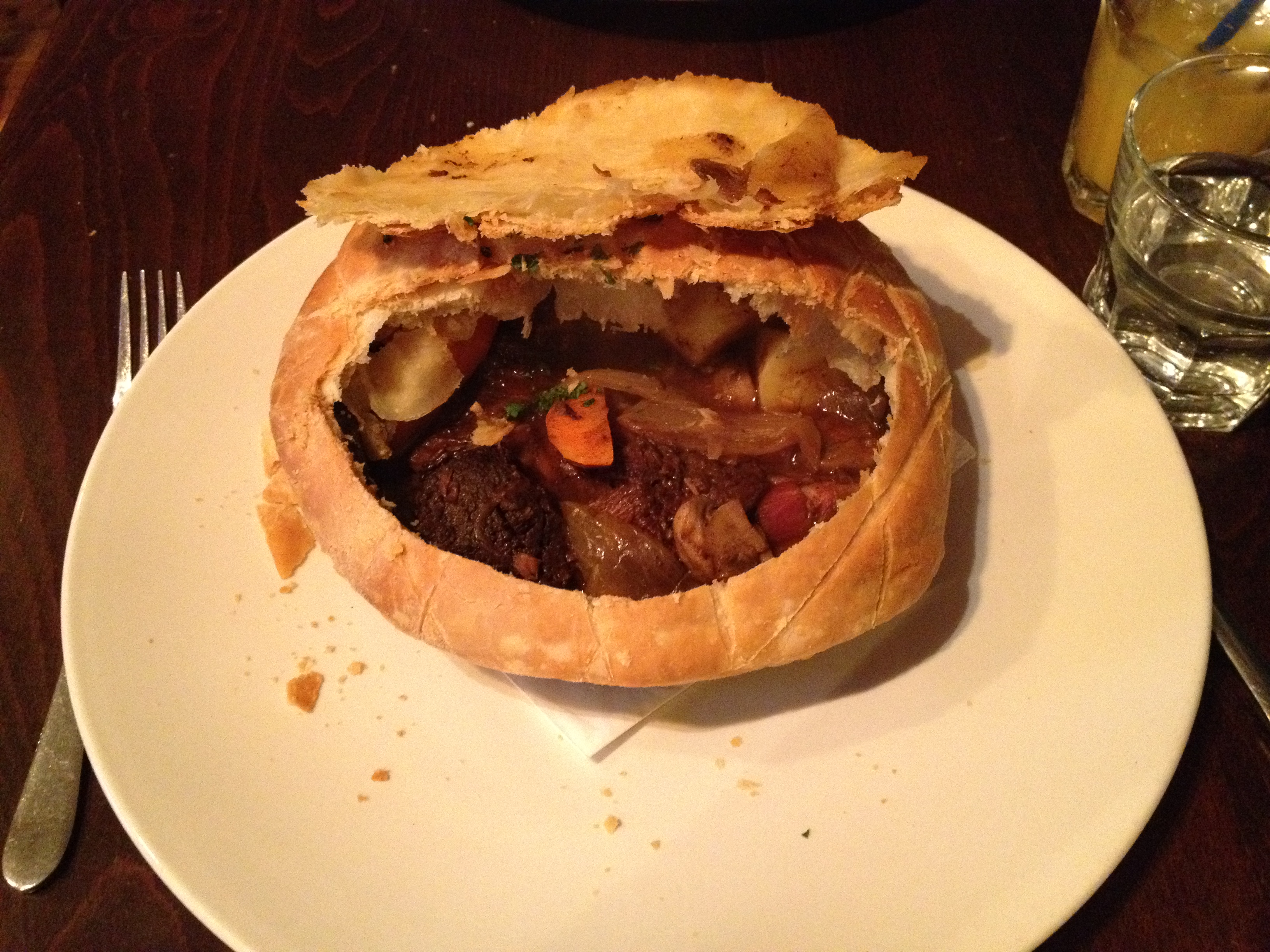 Boeuf bourguignon en croute – slow cooked fine beef in red wine with bacon and steamed vegetables in crispy puff pastry. Had quite a strong wine taste = Not bad
