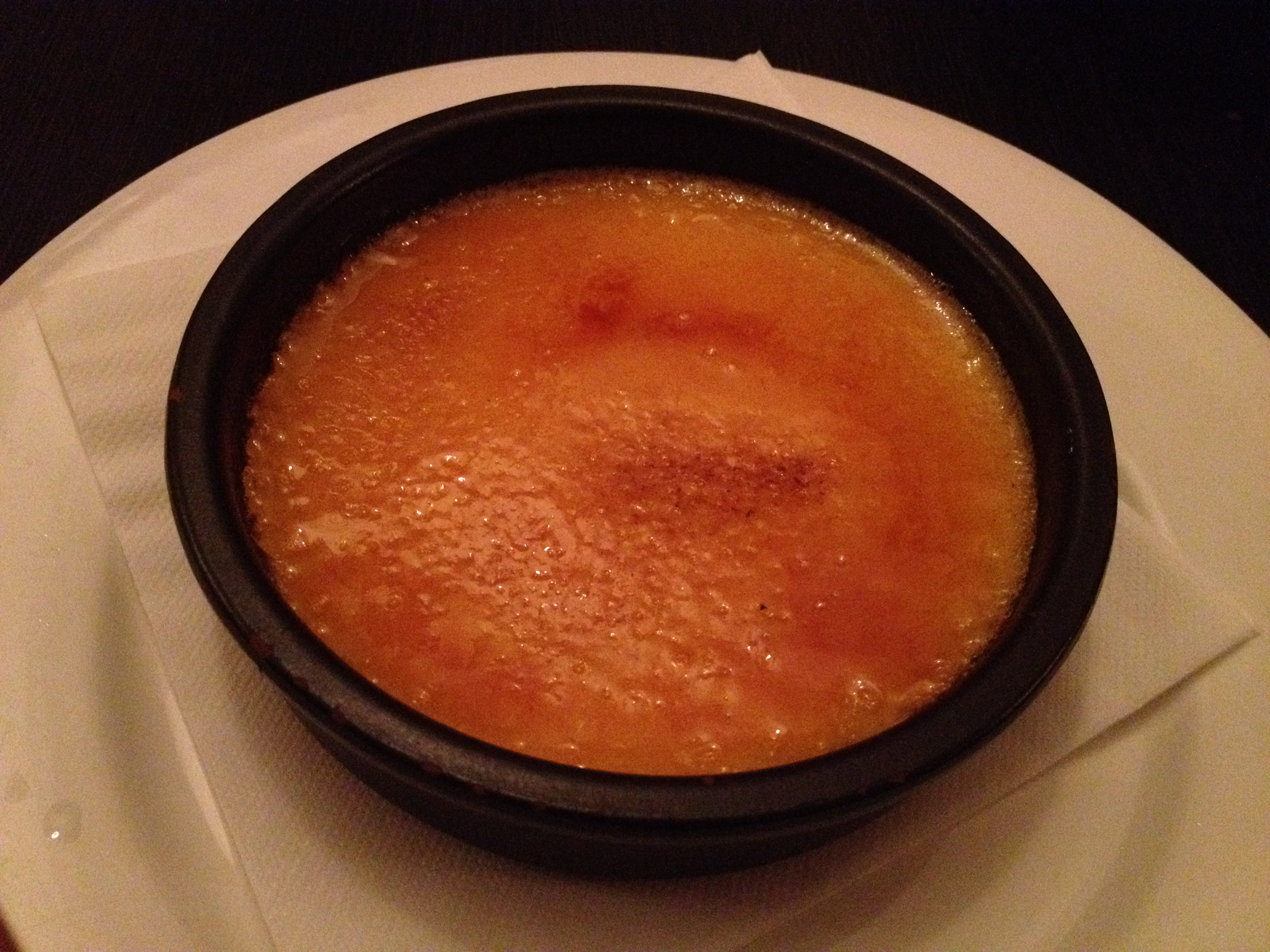Vanilla creme brûlée – rich vanilla custard topped with a delightful sugar crust that cracked perfectly = Excellent