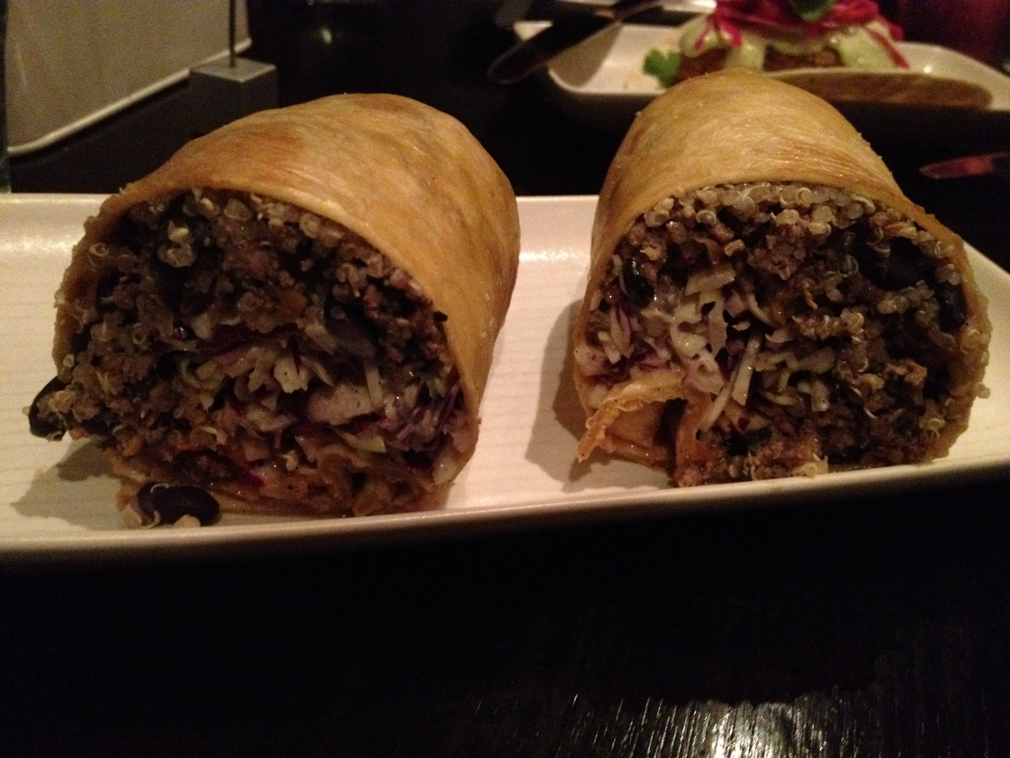 Calabaza picante taco – a delightful combination of spicy roast pumpkin, corn, goats curd and pepitas (chipotle roasted pumpkin seeds) = Good