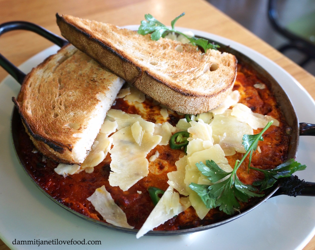 Spiced napoli baked eggs, grilled zucchini, spanish onion, corn, chorizo and manchego cheese served with ciabatta