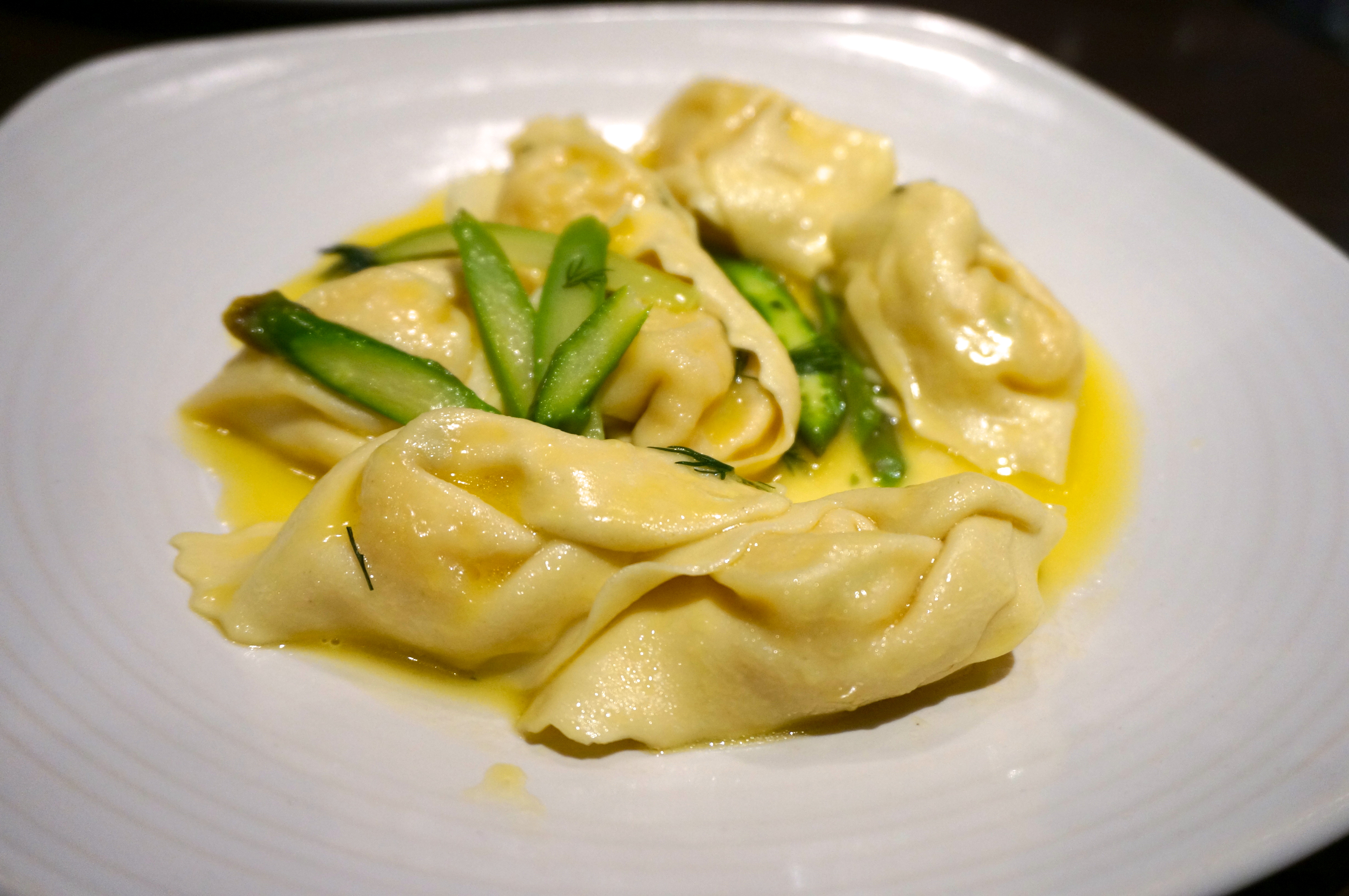Bacalhau ravioli with broad beans, capers and dill