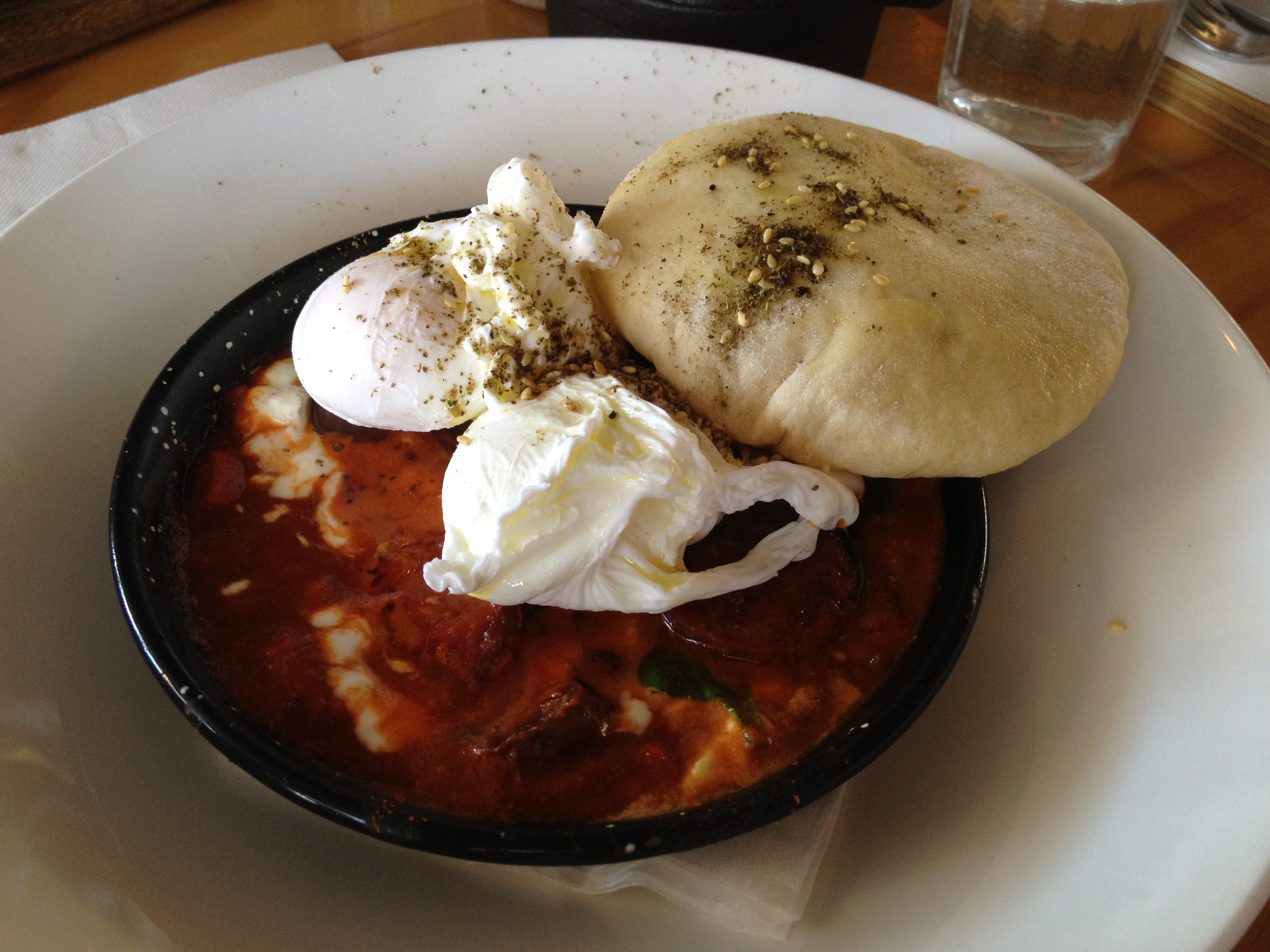 Warming Shakshouka – a rich Middle Eastern inspired tomato salsa baked with spinach, chorizo and chèvre (goats cheese), topped with two poached eggs and served with warm house baked pita bread = Not bad
