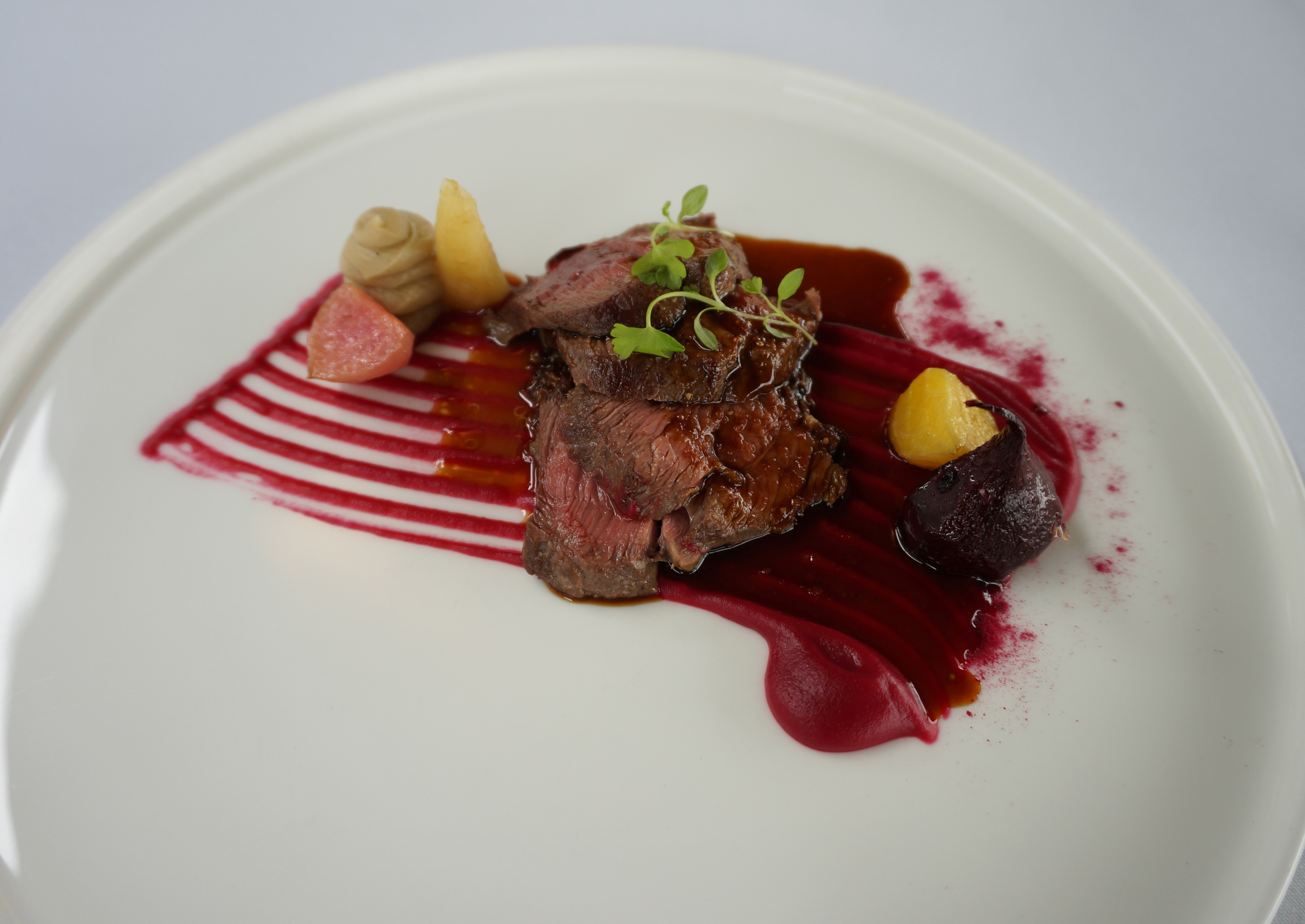 Braised lamb neck, brik pastry, smoked eggplant and harissa pickled cabbage