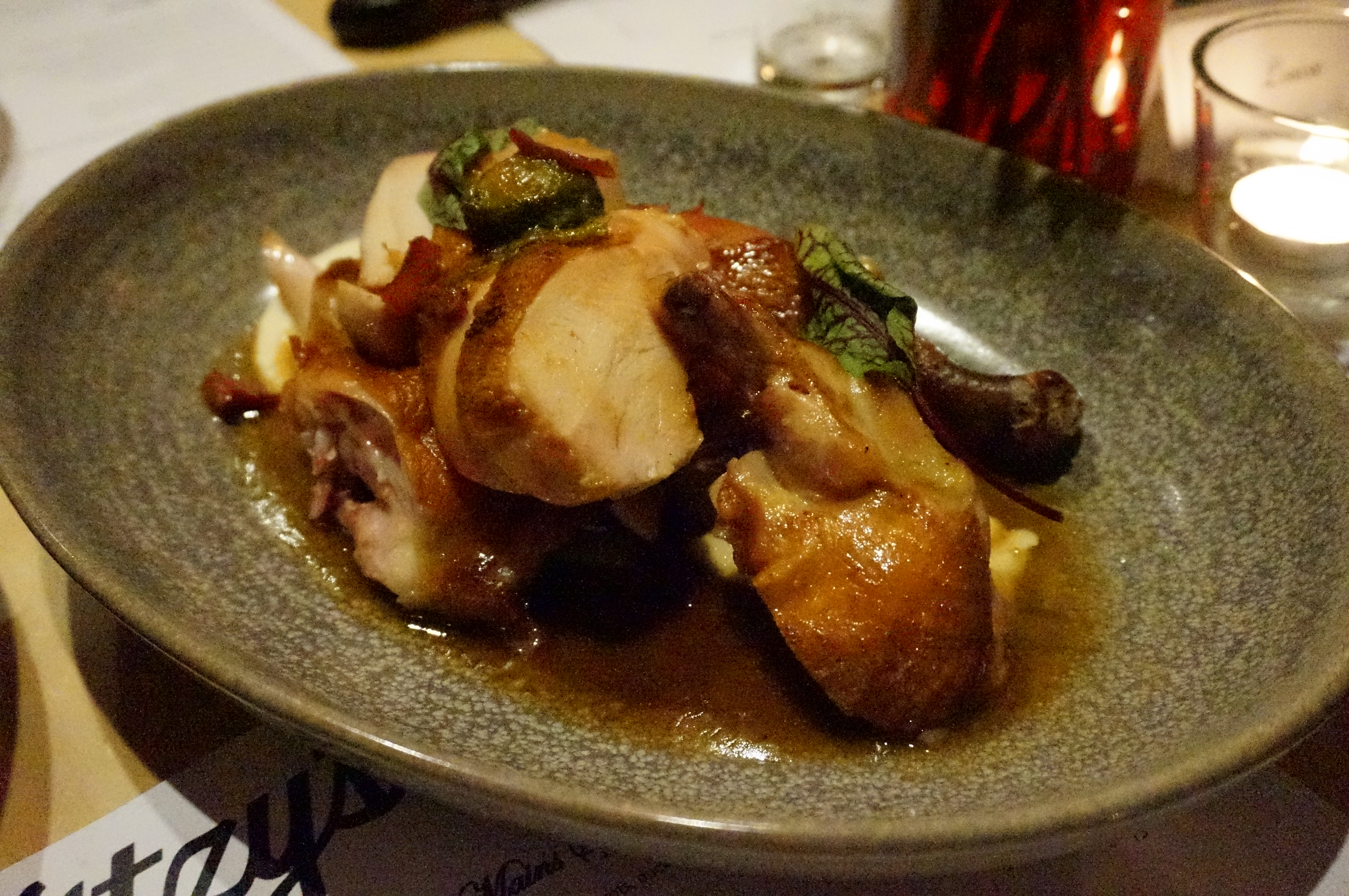 Smoked saskia beer corn fed chicken, roasted celeriac, brussel sprouts