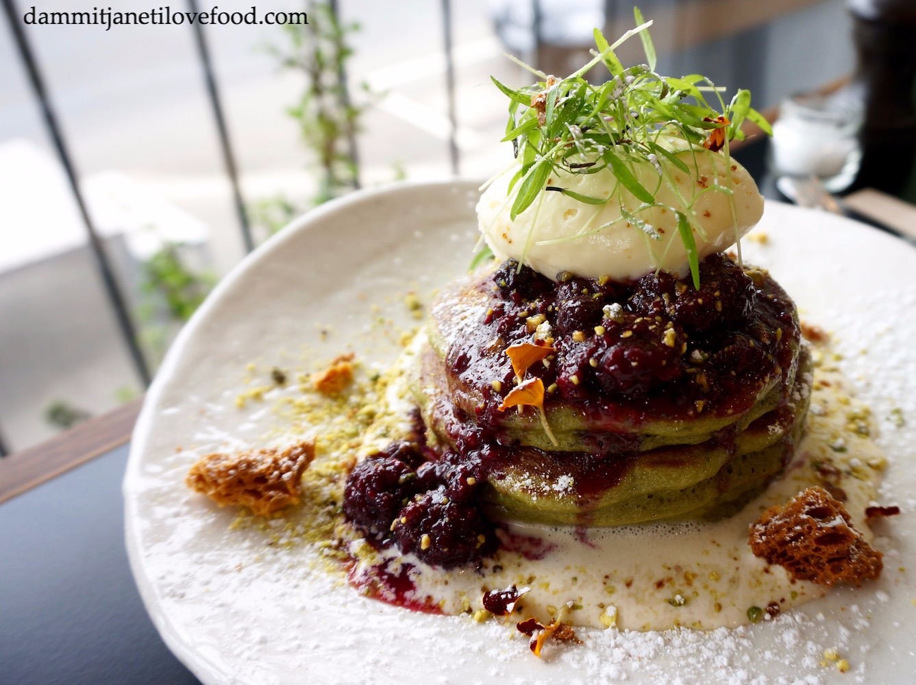 Matcha Hot Cakes with Berry Compote, Honeycomb, Vanilla Mascarpone, Red Bean Crème, Crushed Pistachio