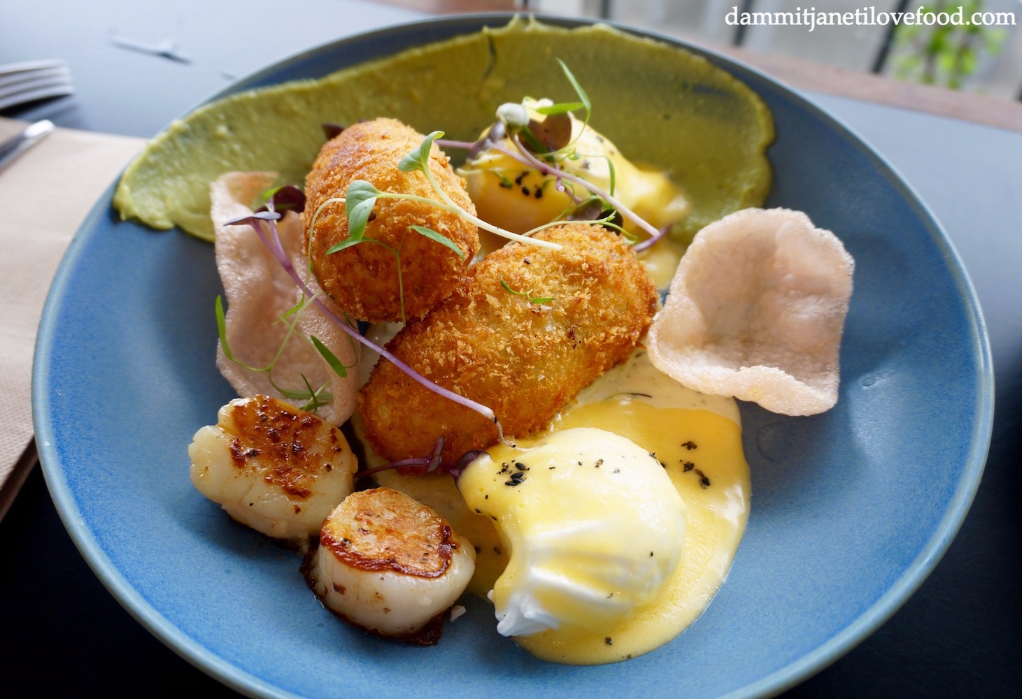 Prawn Croquettes with Scallops, Crackers, Avo Puree, Tartar Dressing, Poached Eggs, Hollandaise and Black Sesame Seeds