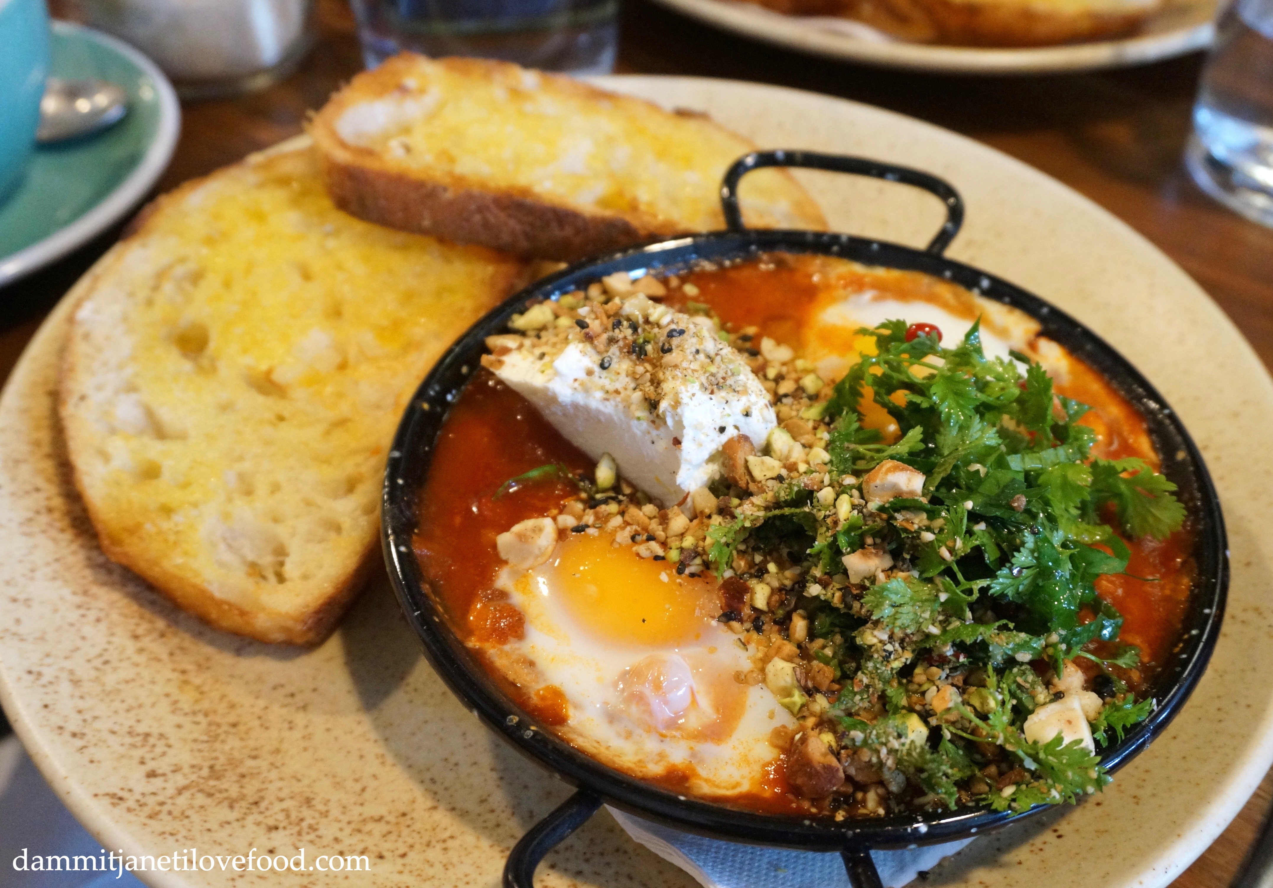 Baked eggs with spicy beans and lentils, fresh herb salad, lemon labne and dukkah served with toasted sourdough