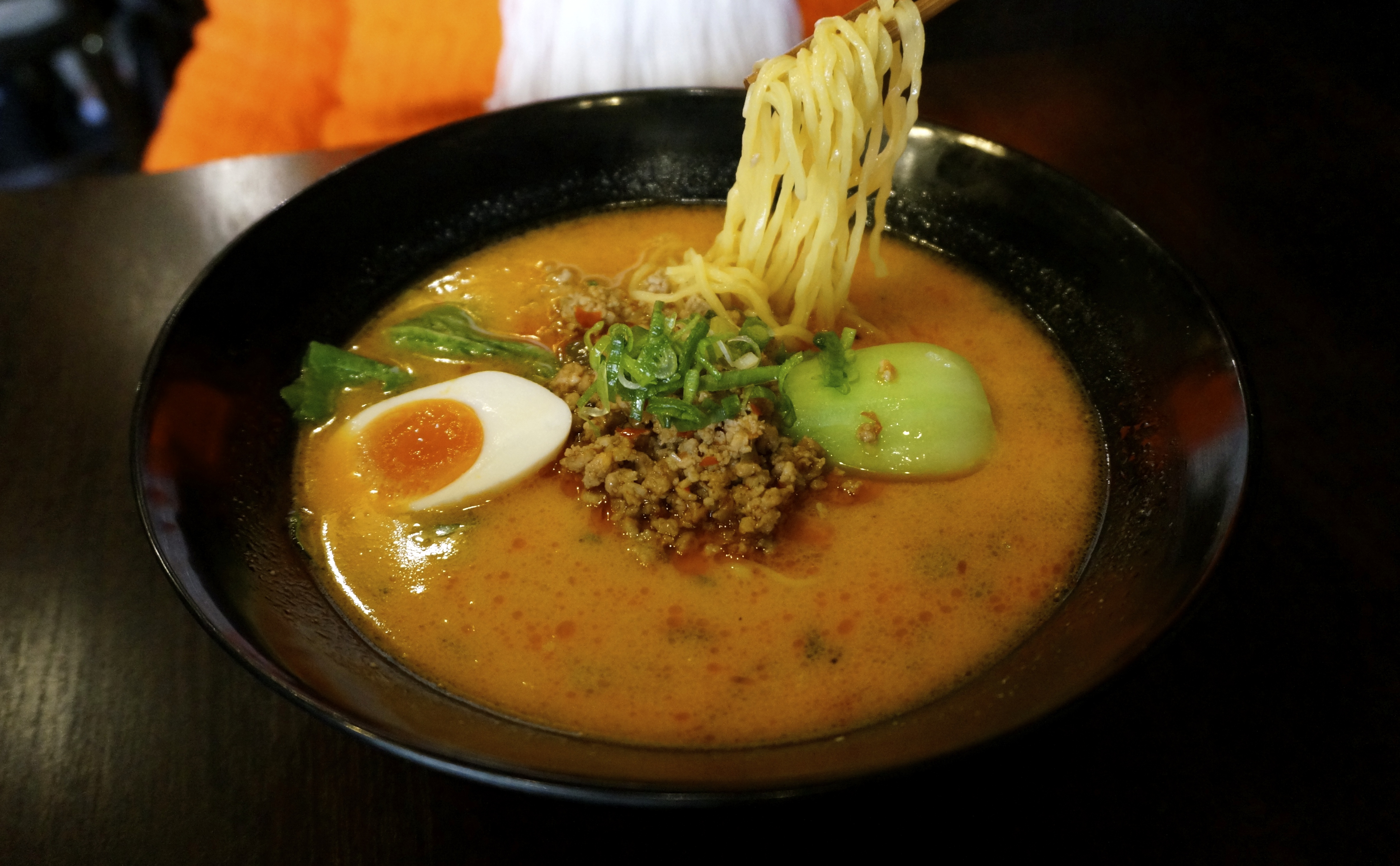 (spicy Hokkaido miso ramen with kurobuta pork, boiled egg, cabbage, onion, bean sprouts, spring onion and sesame)
