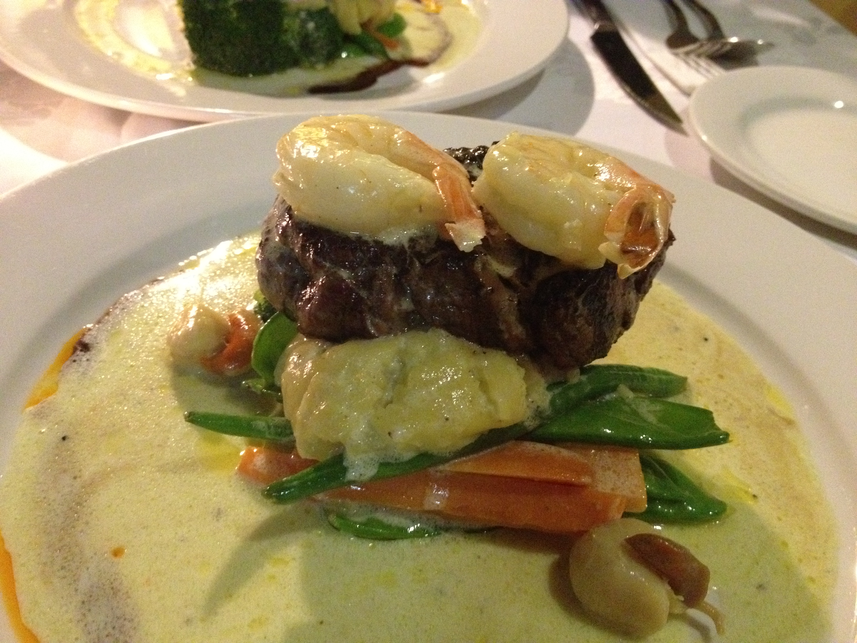 Filet mignon – chargrilled eye fillet (that was cooked precisely as desired) served with scallops, king prawns, buttery mashed potato, steamed vegetables and a cream sauce. I was actually surprised at how good this dish was = Good